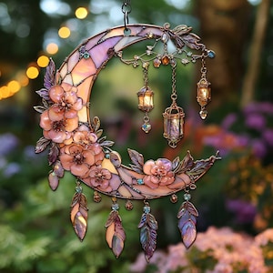 Moon Crescent Faux Stained Glass Acrylic Window Hanging, Floral Lantern Suncatcher, Boho Dreamcatcher Inspired Decor, Gift for Nature Lovers