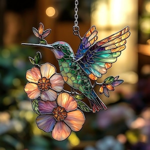 Real Pressed Dried Pteris Flowers and Hummingbird Stained Glass Suncatchers Mother’s Day gifts