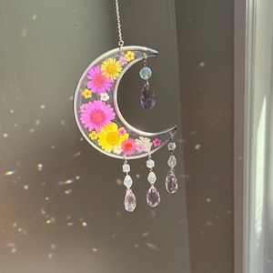 Crescent Moon Floral Suncatcher – Handmade Resin Window Decor with Crystals