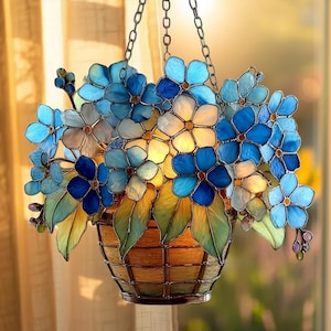 Forget Me Not Hanging Basket Suncatcher, Resin Faux Stained Glass Floral Window Ornament